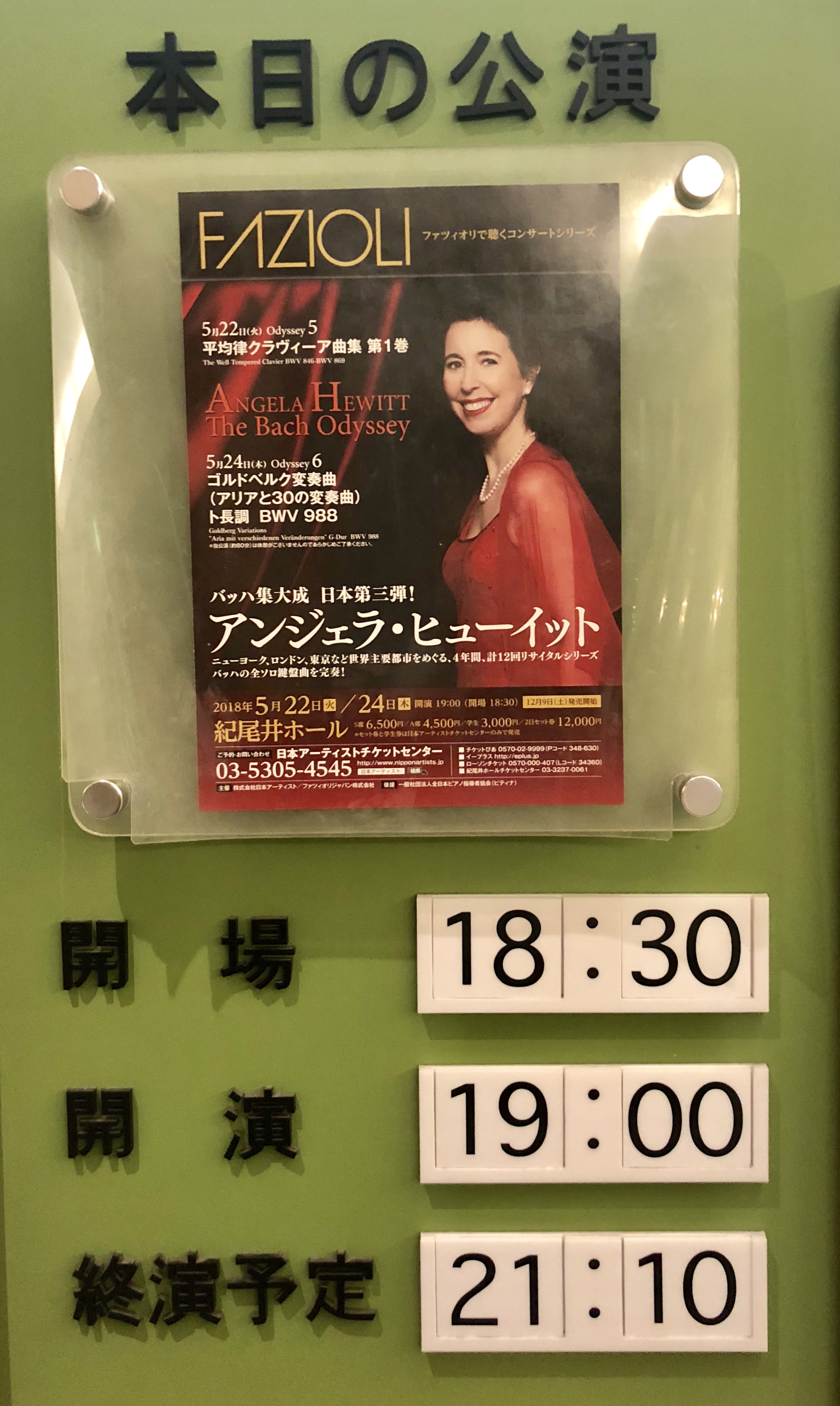 ほぼ満席の紀尾井ホール。アンジェラ・ヒューイットのコンサートでは、なぜだかほとんど知人に会うことがないのです。たいてい世界的に活躍するアーチストのコンサートでは、あっちに知り合い、こっちに知り合いを見かけるのに、ヒューイットのコンサートでは知人と会うことがまずない。少し客層が違うのでしょうか。学生らし