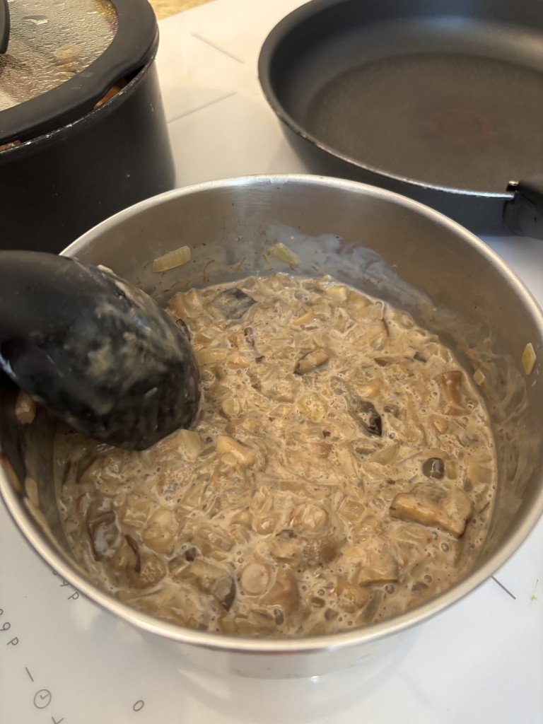 ピオトロフスキ先生のお家で。お料理途中の秋のキノコ🍄‍🟫のサワークリーム煮 美味しい!